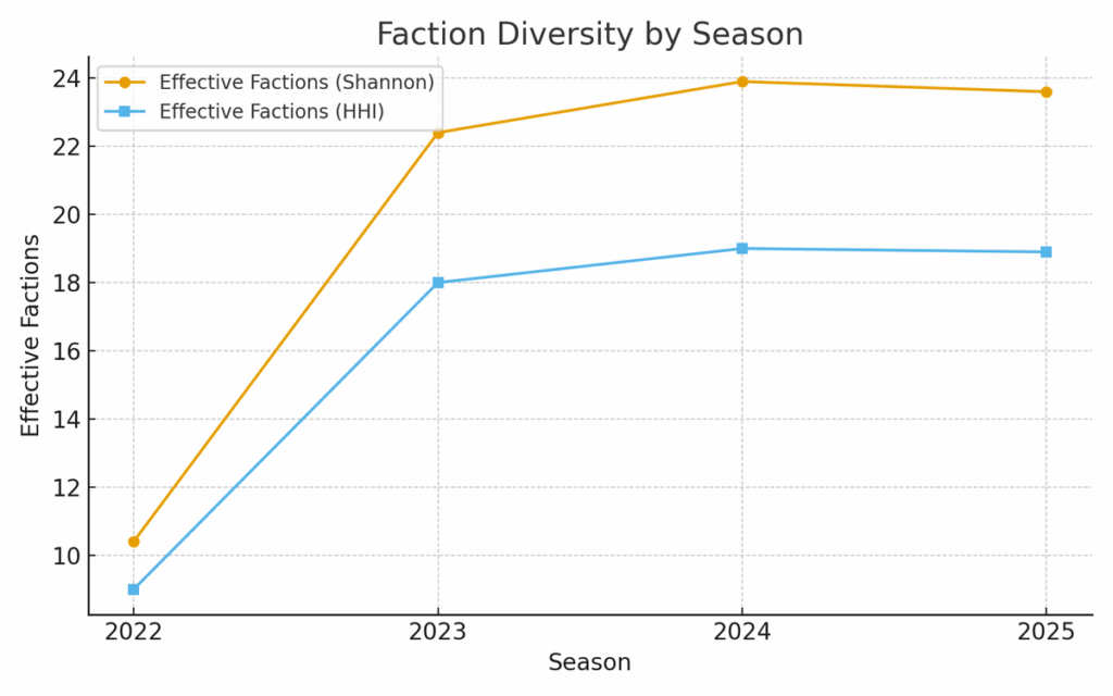 SeasonFaction Diversity HHIEffective Factions (HHI)Shannon EntropyEffective Factions (Shannon)