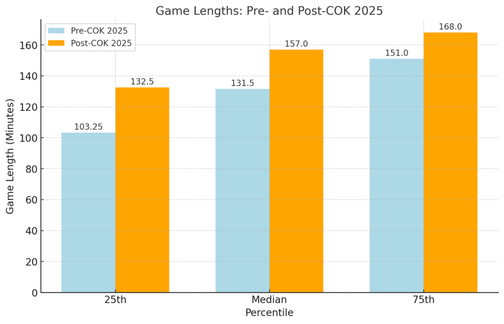 One of the biggest shifts this year came with the November 2024 Clash of Kings (COK) rules update. This significantly impacted game lengths, as shown below: