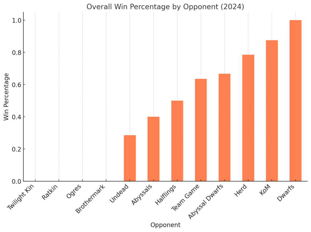 Explore my 2024 Kings of War journey: 41 games, detailed statistics, and key insights into faction performance and game dynamics.