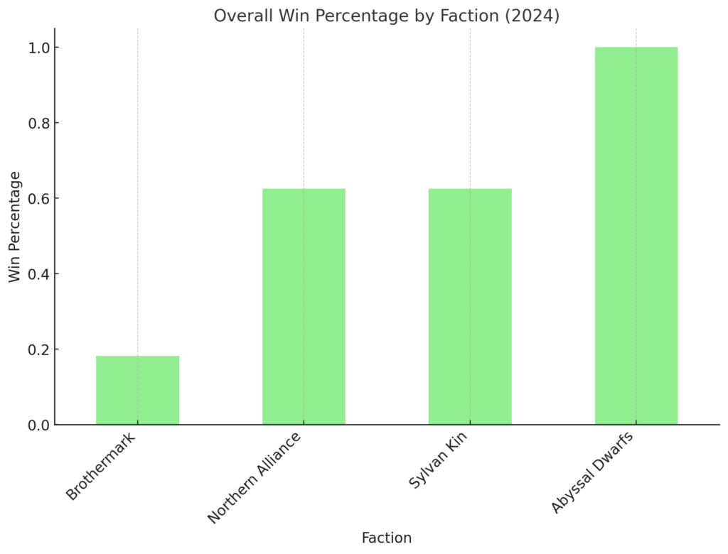 This year, I experimented heavily with the Brothermark, trying to make penitent spam work effectively. Despite my efforts, the results were mixed. Late in the year, I switched back to Northern Alliance to close out the year on a strong note. I also managed to get in a few games with my son’s Abyssal Dwarf list. Here’s how my factions performed: