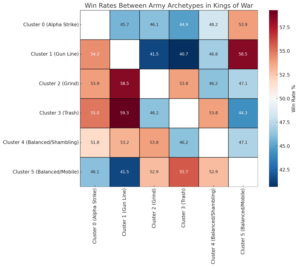 In my previous post, I introduced and quantified the six distinct army archetypes in Kings of War through a clustering analysis. These archetypes—Alpha Strike, Gun Line, Grind, Trash, Balanced/Shambling, and Balanced/Mobile—represent the strategic approaches players employ in competitive play. If you’re familiar with Death by Dragon’s army primers, this concept will seem very clear to you. Today, I want to dig deeper into the dynamics of these clusters by examining how they perform against one another in tournament matchups. I’ve pulled data from multiple tournaments, categorized the lists as described in my previous post, and then dug into how those archetypes perform against each other. As expected, there is a real rock-paper-scissors effect in Kings of War army interactions. Understanding these interactions can provide invaluable insights for refining your strategies and thinking through match-up implications.
