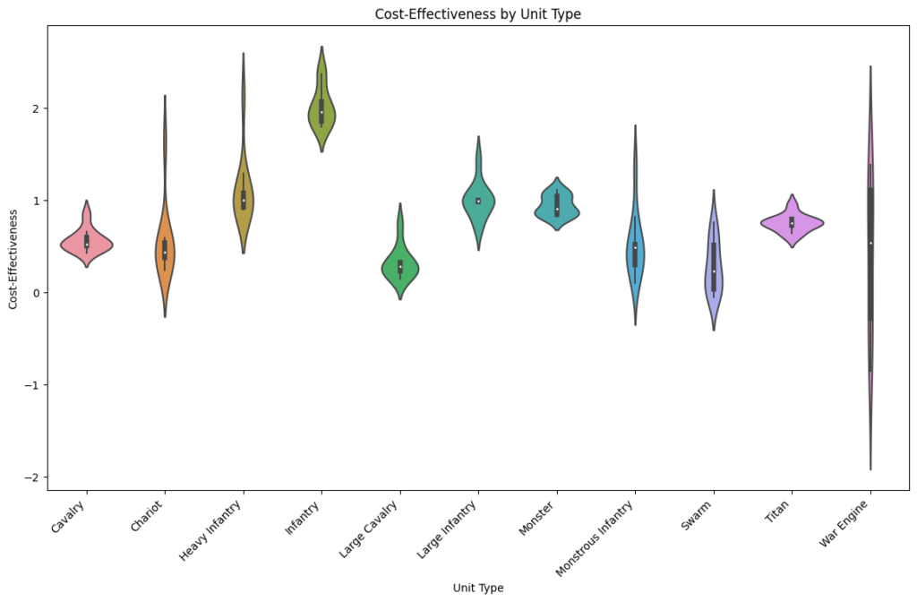 The violin plot below visualizes the distribution of cost-effectiveness scores across different unit types. It provides insights into the variability and central tendencies within each category, aiding in comparative analysis: