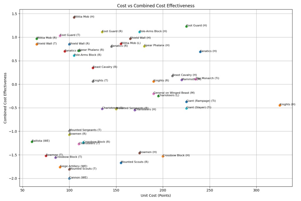 In the KoM, some units shine especially bright in terms of delivering value for their points. Below is a list of the five most cost-effective units, comparing their combat efficiency and points value. For more details on how I calculate cost-effectiveness and Elo ratings, you can check out my comprehensive analysis here: Evaluating Unit Cost-Effectiveness in Kings of War Using Elo Ratings for the CoK 2025 Updates. Additionally, the ‘% Kills’ columns indicate the effectiveness of these units in a charge scenario versus different defense levels—specifically against Defense 4 (with 13/15 nerve) and Defense 5 (with 16/18 nerve). This gives a sense of their ability to take out opponents in a single charge, which is crucial in determining their battlefield impact.