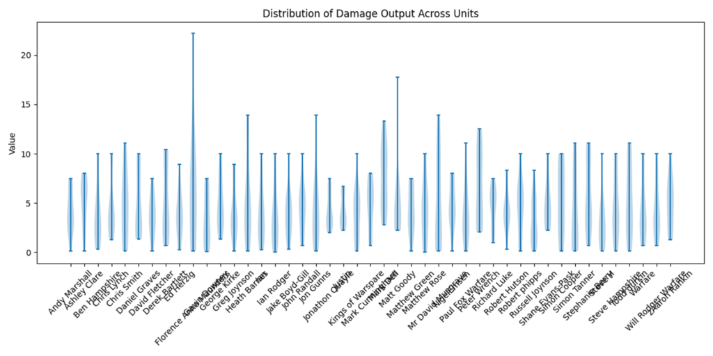 A detailed analysis of damage output adds another layer to understanding the lists. The chart below is a violin plot that highlights the distribution of damage output across units, showcasing notable powerhouses such as Florence Maunders’ Knight Horde. Florence’s list can also deliver substantial damage at a range of 20+ inches, making it highly versatile in its offensive reach.