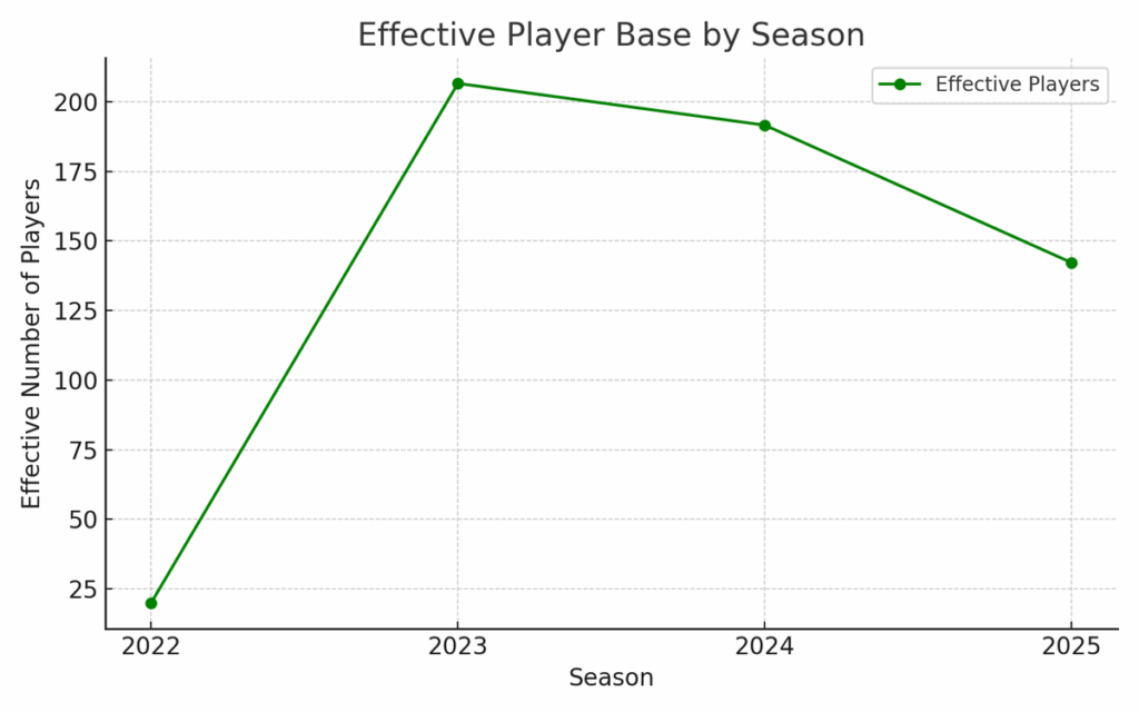 I also checked player concentration (Scene HHI). Here the metric asks: is the same small clique entering everything, or do we see broad participation? The answer is encouraging — effective player counts are high, and unique participation is strong across seasons. This is what keeps the game sustainable: new and returning players mixing into the pool.
