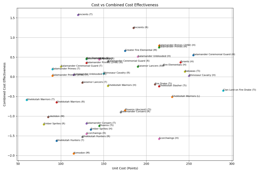 Here are the Salamanders’ top-performing units based on their cost-effectiveness. This metric evaluates a unit’s Elo rating and battlefield impact relative to its point cost: