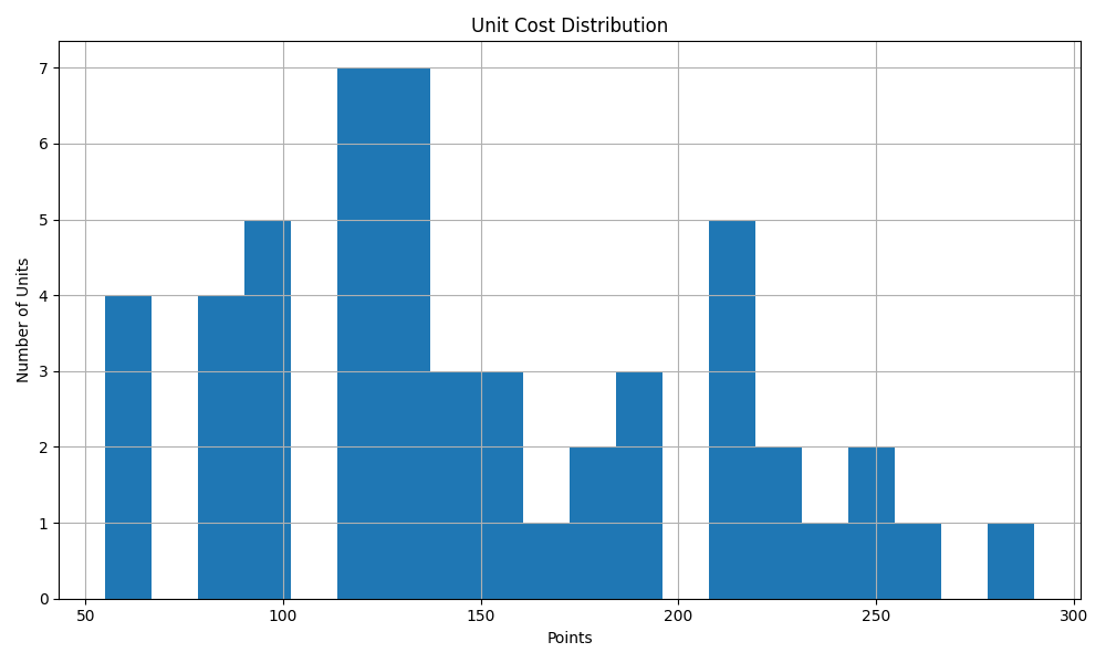 A histogram showing the spread of Salamander unit costs. The majority of units fall between 100 and 200 points, emphasizing mid-tier options.