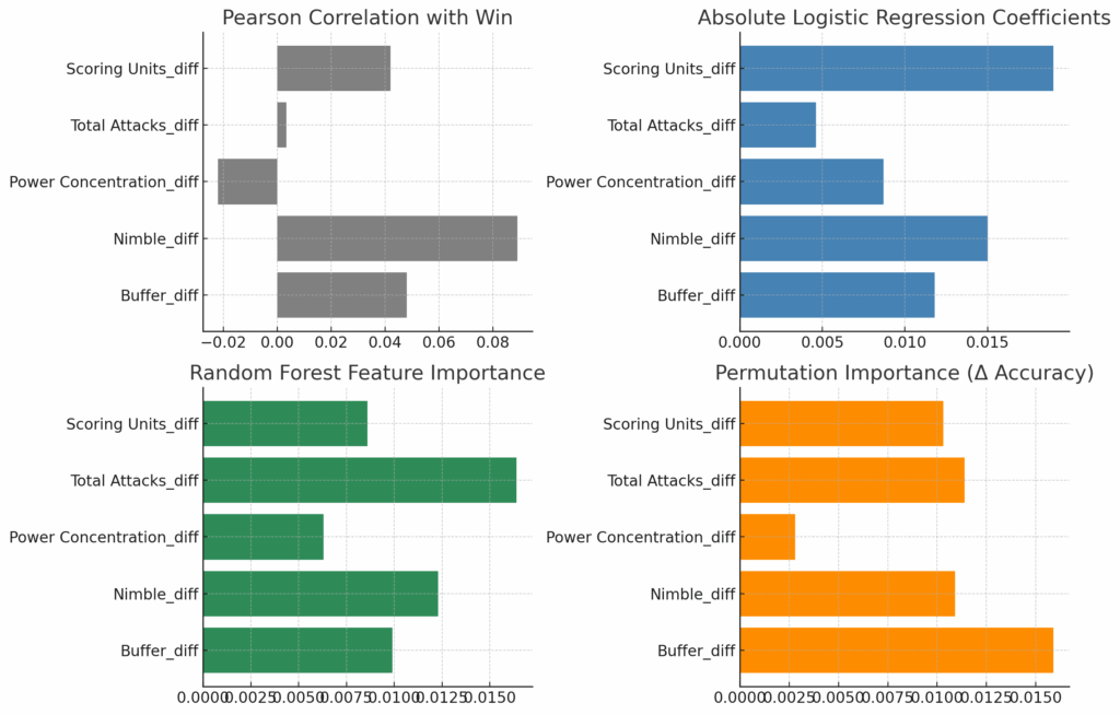 Each of these five insights emerged consistently across every statistical method I ran—and they were the only factors to do so. They (1) correlated most strongly with “win” in raw linear analysis; (2) carried the highest absolute weights in logistic regression; (3) scored highly in the random forest’s feature importance; and (4) caused the largest drop in model accuracy when permuted. Here’s how they ranked across each method: